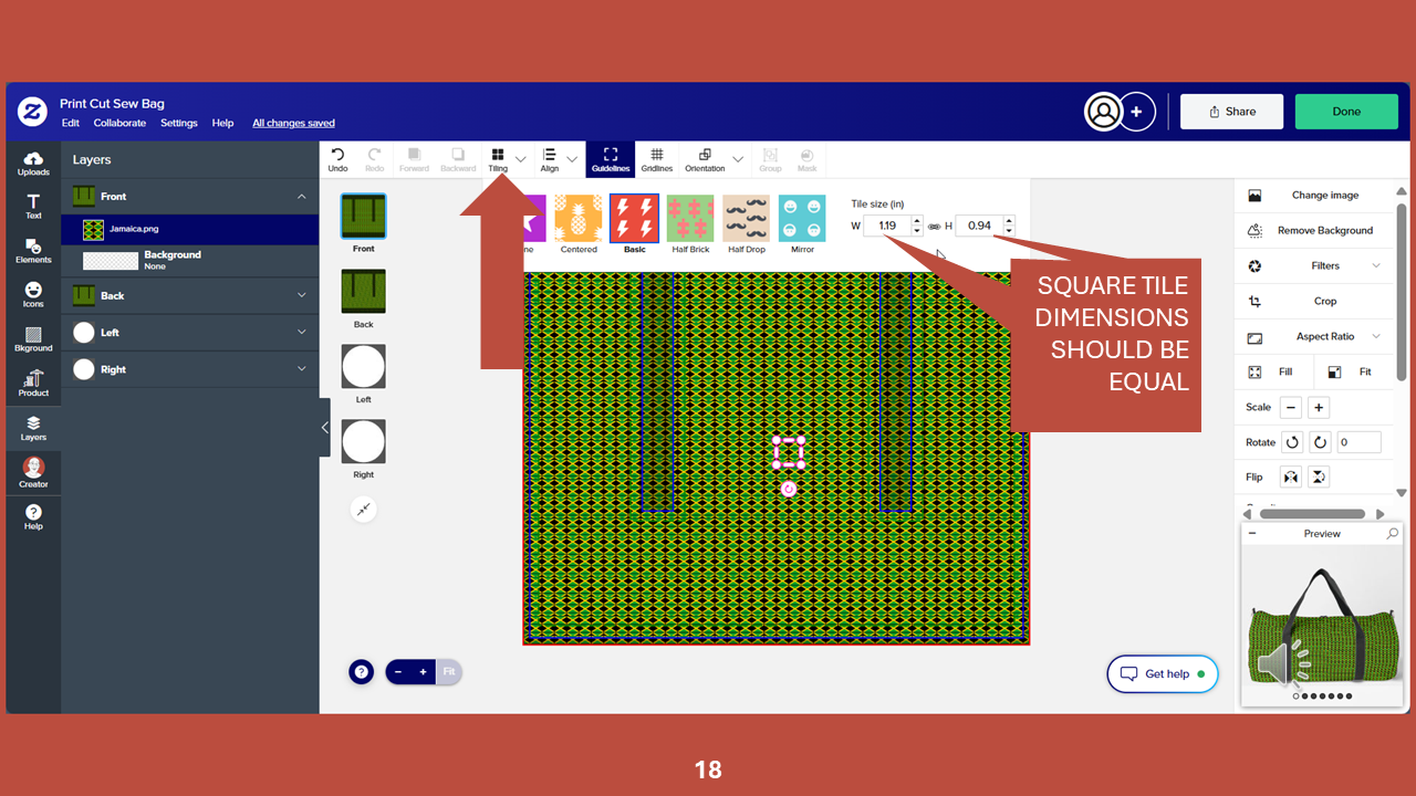 You will be taken to the duffel bag product page and the Jamaica flag pattern will have been transferred. Click EDIT THIS DESIGN.