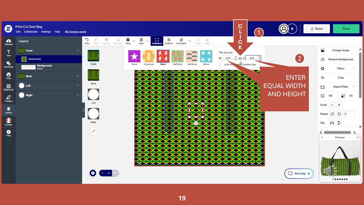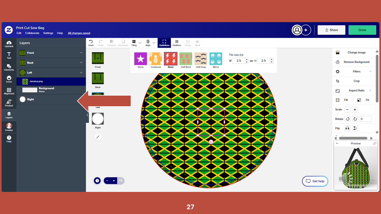 In Zazzle designer, open the LAYERS panel and select the Jamaica flag pattern tile, if it is not already selected. Next, change the ROTATE setting from -30 to 0. The angle of the pattern on the art board will shift.