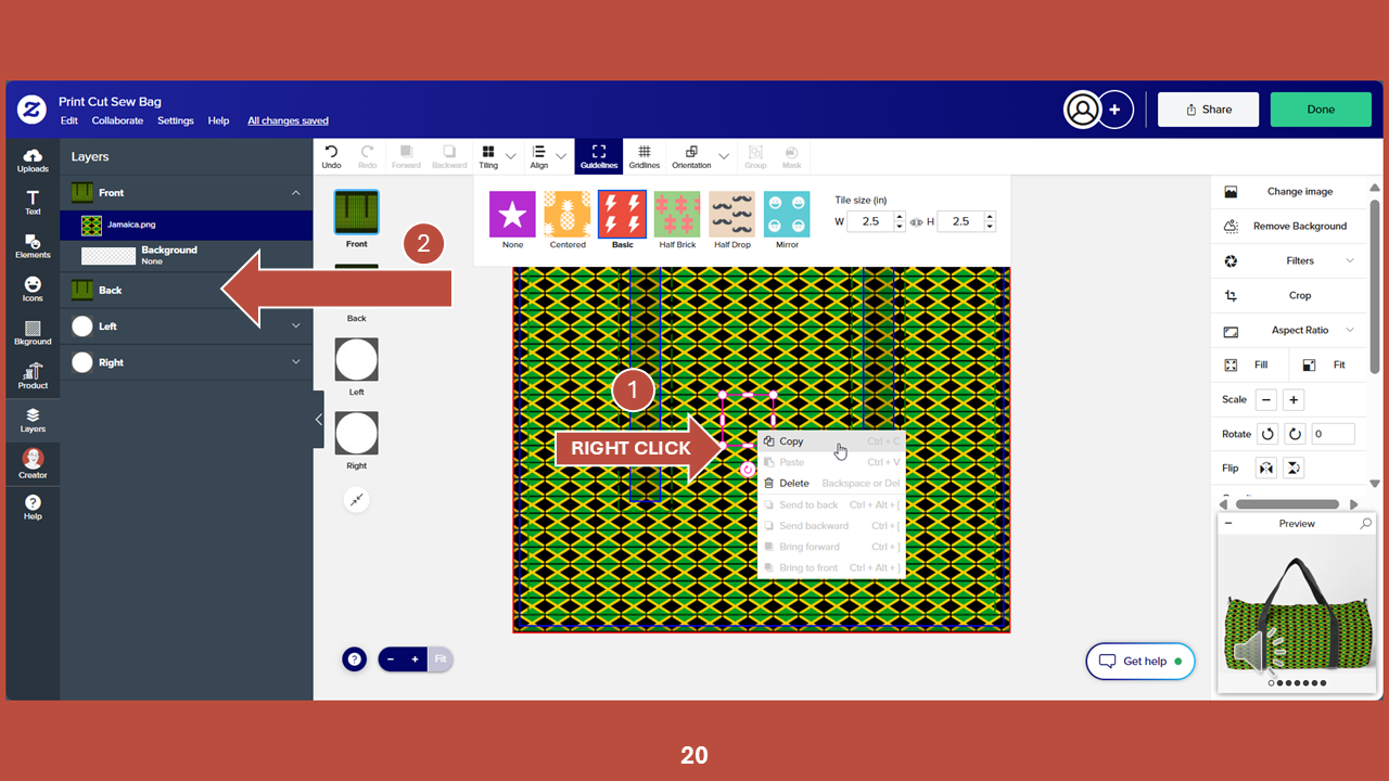 Now we need to update the pattern on the other layers of the duffel bag. On the art board, right-click on the selected tile and choose COPY. Then, in the layers panel choose BACK.